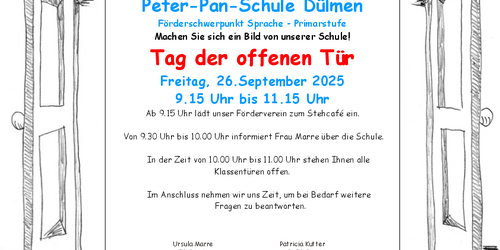 Die Peter-Pan-Schule, Förderschule mit dem Schwerpunkt Sprache (Primarstufe) des Kreises Coesfeld in Dülmen, lädt herzlich am Freitag, den 26. September zum Tag der offenen Tür ein. Zwischen 9:15 Uhr und 11:15 Uhr haben interessierte Eltern die Möglichkeit, die Schule kennenzulernen und einen Eindruck vom Schulleben zu gewinnen.