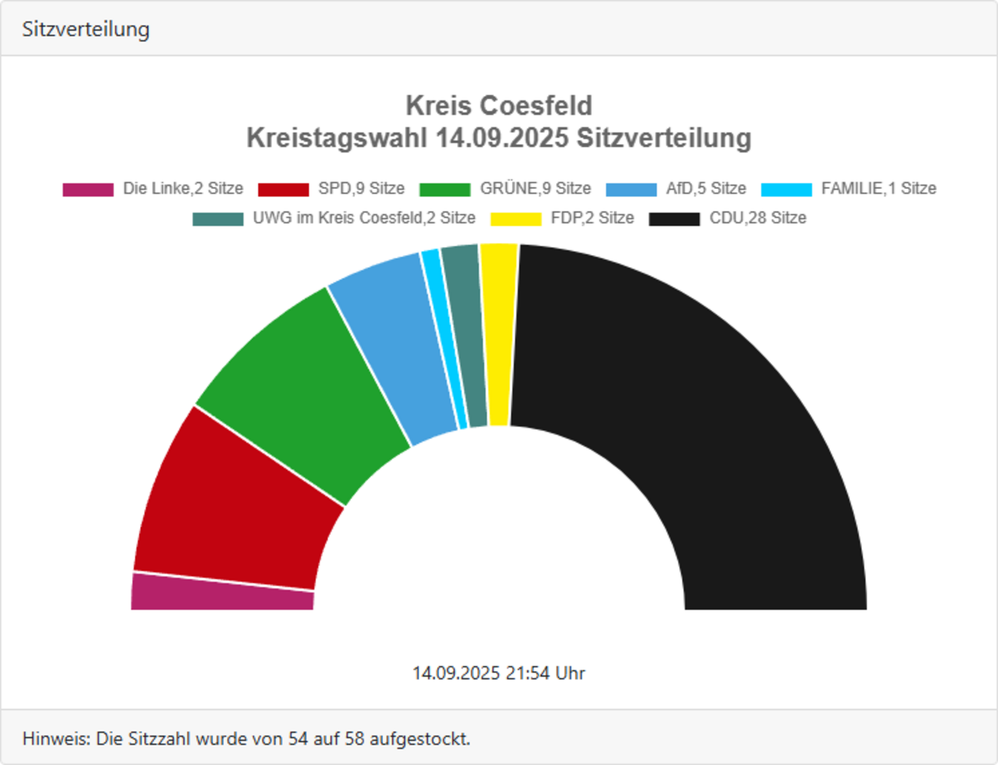 Verteilung der 58 Sitze nach der Kreistagswahl 2025: CDU 28 Sitze, Grüne 9 Sitze, SPD 9 Sitze, FDP 2 Sitze, UWG im Kreis Coesfeld 2 Sitze, Die Linke 2 Sitze, FAMILIE 1 Sitz und AfD 5 Sitze