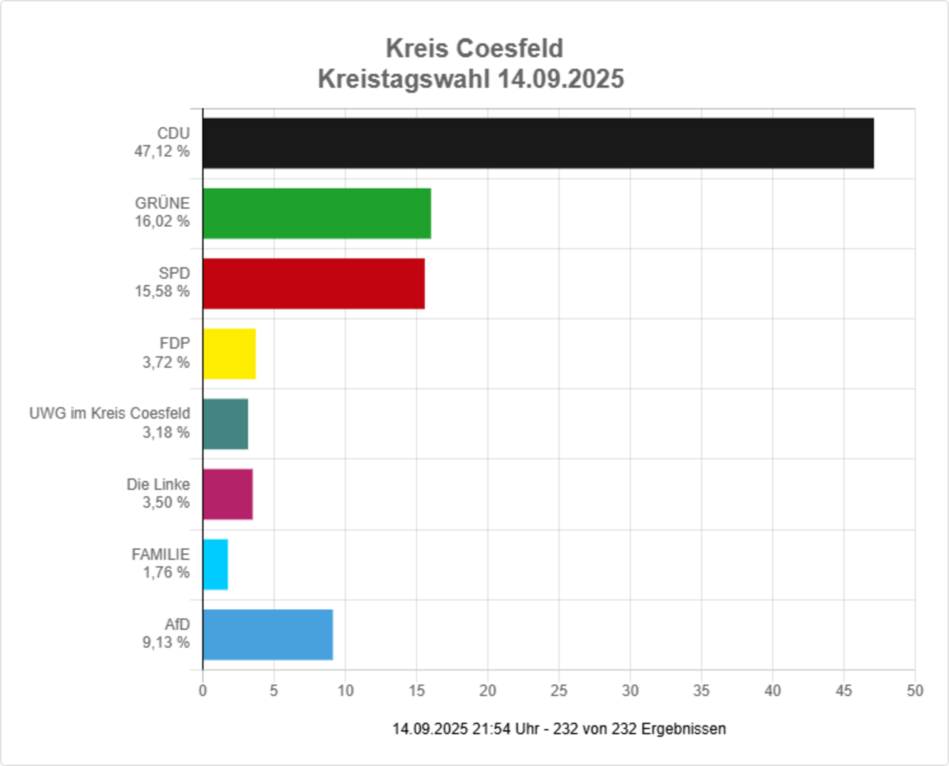 Vorläufiges amtliches Endergebnis der Kreistagswahl 2025: CDU 47,1 % Grüne 16,0 %, SPD 15,6 %, FDP 3,8 %, UWG im Kreis Coesfeld 3,2 %, Die Linke 3,5 %, FAMILIE 1,8 % und AfD 9,1 %