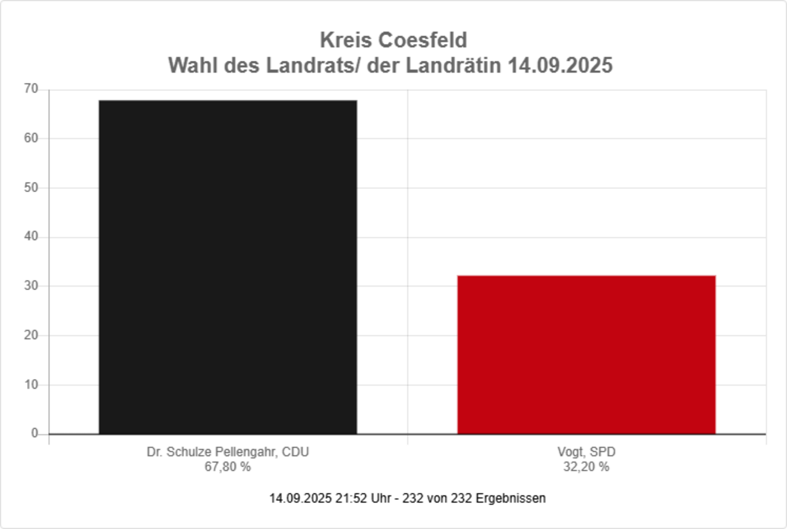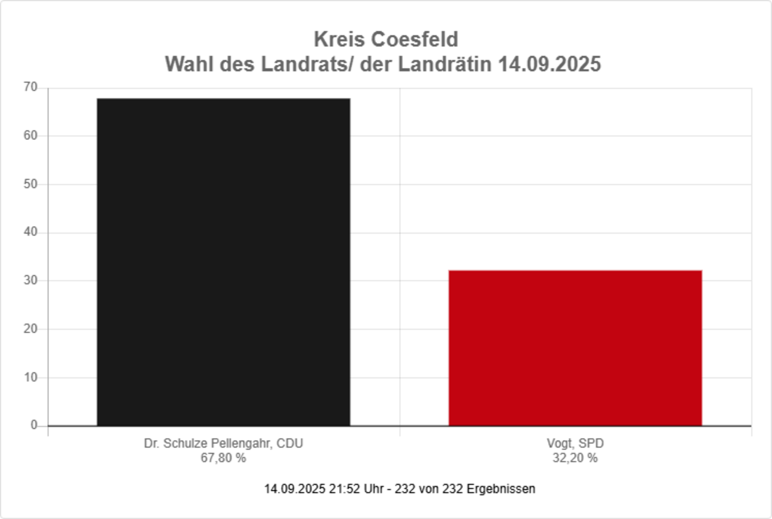 Vorläufiges amtliches Endergebnis der Landratswahl 2025: Dr. Christian Schulze Pellengahr (CDU) 78822 Stimmen 67,8 % und Hermann Josef Vogt (SPD) 37434 Stimmen 32,2 %