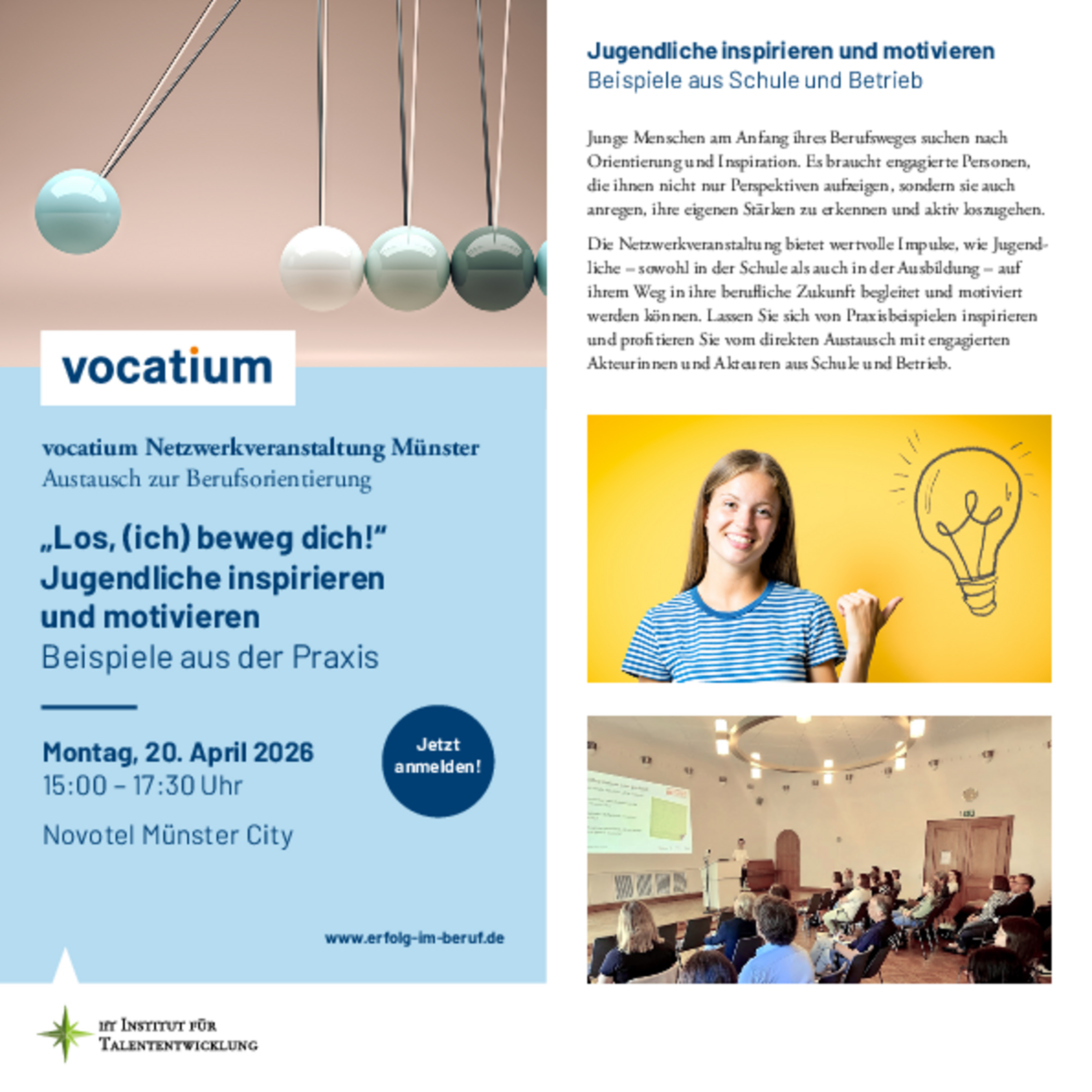 Junge Menschen am Anfang ihres Berufsweges suchen nach Orientierung und Inspiration. Es braucht engagierte Personen, die ihnen nicht nur Perspektiven aufzeigen, sondern sie auch anregen, ihre eigenen Stärken zu erkennen und aktiv loszugehen. Die Netzwerkveranstaltung des Instituts für Talententwicklung (IfT) bietet wertvolle Impulse, wie Jugendliche – sowohl in der Schule als auch in der Ausbildung – auf ihrem Weg in ihre berufliche Zukunft begleitet und motiviert werden können. Lassen Sie sich von Praxisbeispielen inspirieren und profitieren Sie vom direkten Austausch mit engagierten Akteurinnen und Akteuren aus Schule und Betrieb.
