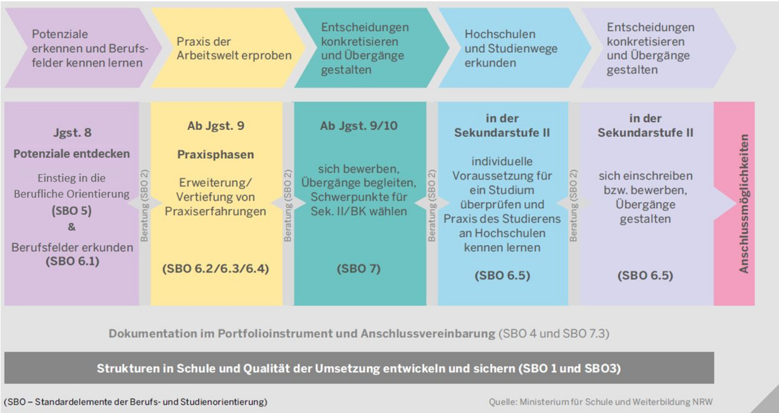 Die Landesregierung Nordrhein-Westfalen hat gemeinsam mit den Partnern im Ausbildungskonsens den Übergang Schule – Beruf in NRW flächendeckend und systematisch gestaltet. Unter dem Motto „Kein Abschluss ohne Anschluss (KAoA)" werden alle Jugendlichen in den Blick genommen und ihnen wird mit einer systematischen Studien- und Berufsorientierung ab Klasse 8 zu konkreten Anschlussperspektiven verholfen.