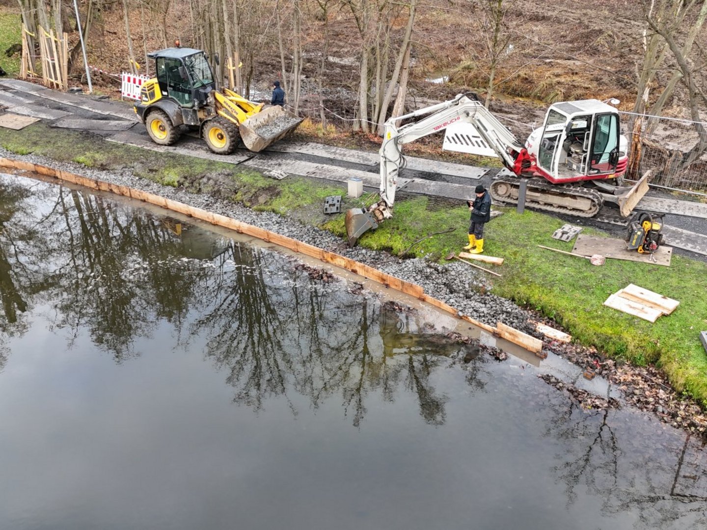 Kreis CoesfeldSeit dem 01. Dezember haben die Arbeiten an der Uferlinie begonnen. Der alte Uferschutz war komplett verwittert und es guckten nur noch die alten Pfosten aus dem Wasser. Durch den Wellenschlag und tierischen Fraß von Enten und Nutrias ist die Uferlinie stark zurückgewichen. Jetzt werden Eichenpfähle in die Erde gerammt, auf denen Eichenbretter als neuer Uferschutz verschraubt werden. Die Uferlinie wird wieder angefüllt und Raseneinsaat aufgetragen. Zudem wird ca. 30 % des Uferbereichs mit Sumpfpflanzen wie z. B. Sumpfschwertlilien bepflanzt.