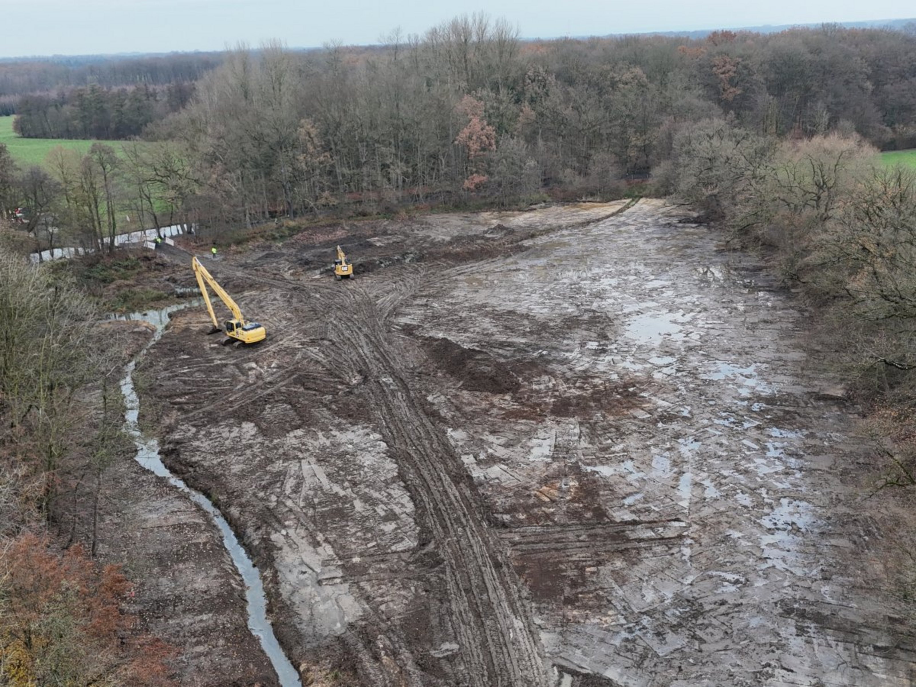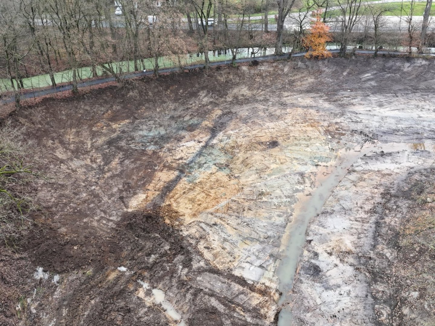 Kreis CoesfeldDie neue Gewässersohle wird modelliert. Um das Gewässer ökologisch sinnvoll und klimaresilient zu formen, wird im südlichen Teil die Tiefe geformt, um Fische und Reptilien vor Frost zu schützen.